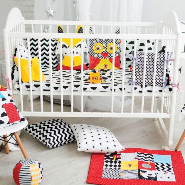 Бортики мають спеціально розроблену кольорову гамму, а контрастні зображення, лінії і фігури сприяють розвитку зору малюка. Бортики пошиті з натуральних, високоякісних, гіпоалергенних тканин. Кожен бортик надійно кріпиться до ліжечка за допомогою стрічок.